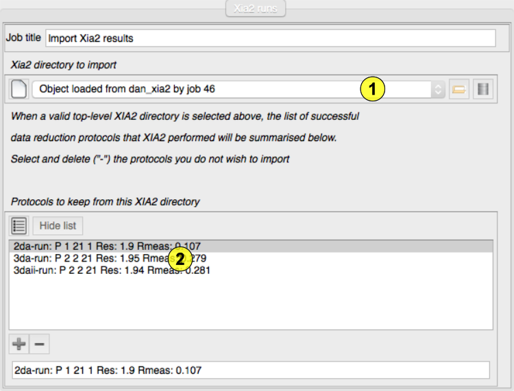 The name and some important data (space group, maximum resolution and Rmeas) are listed(2)and you can choose not to import a run by selecting it and then clicking the '-' button.