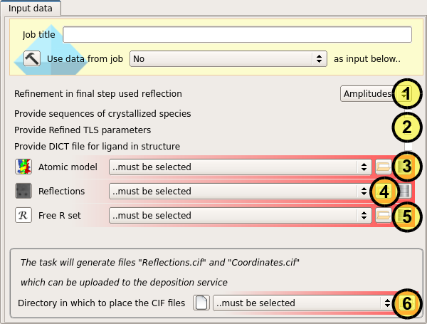 The refined atomic model (3), the observations against which the model was refined (4), and the Free-R set must then be specified so that the refinement result can be confirmed (5). The observations may be amplitudes or intensities as specified previously, but must be the same as used in the final refinement.