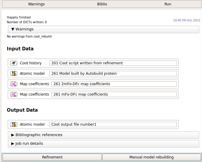 The report details all the data objects which were passed to Coot, and also any files which where saved from Coot into the CCP4i2 database.