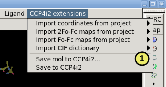 Note: for changes to be saved in the CCP4i2 database, you must save your changes through the CCP4i2 extensions menu (1), not through the normal File/Save menu in Coot. If you use File/Save by mistake, you can re-import the saved model, but you will have no record of the task.