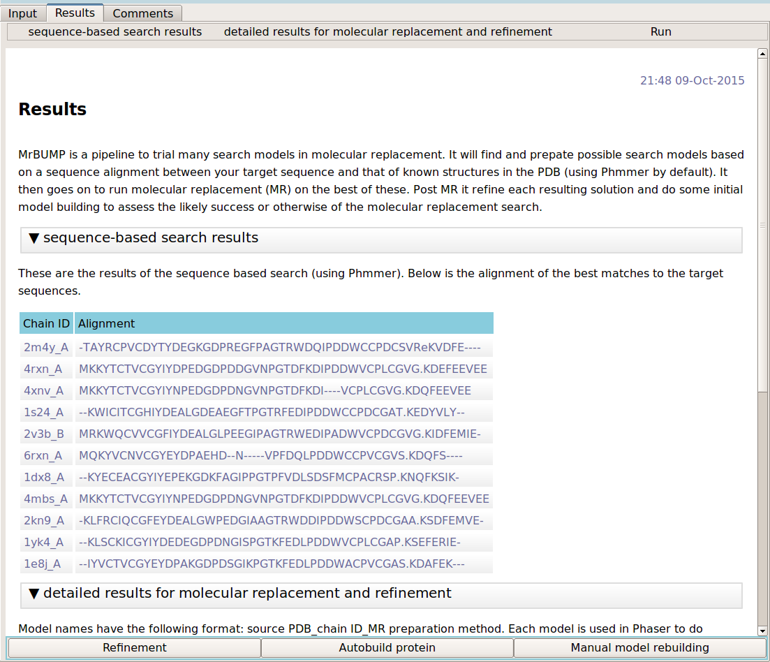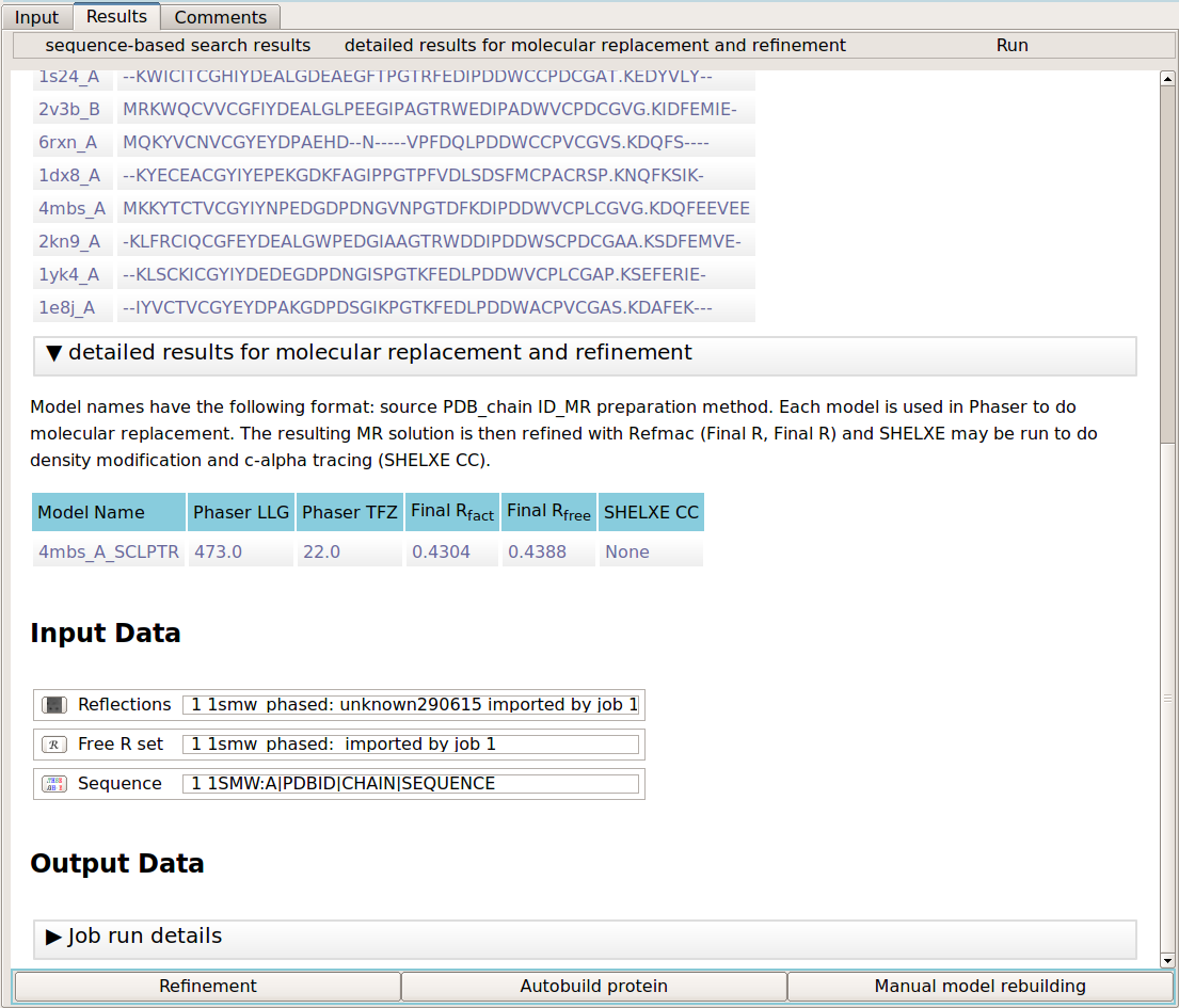 The output of the program comprises of the sequence-based search results and the results of molecular replacement and refinement. The first section details the search results. It lists the known PDB chains and their alignment to the target sequence. The MR results section gives a table of results for each of the search models in molecular replacement. The results include the Phaser LLG and TFZ scores, the refinement R values (R/Rfree) and the SHELXE correlation coefficient (CC) between the c-alpha trace and the experimental data. Note that SHELXE is only used where the data is 2.4 Angstroms or better.