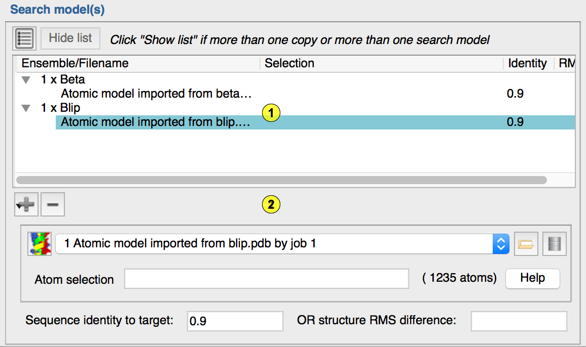 Searching for more than one copy. To search for more than one copy of an ensemble, you will need to have clisked "Show list" to reveal the Expanded search model dialog. The number of copies to search for in this run is set be selecting the relevant ensemble in the search model tree and then specifying the number to search fo r in the search model detail panel.
