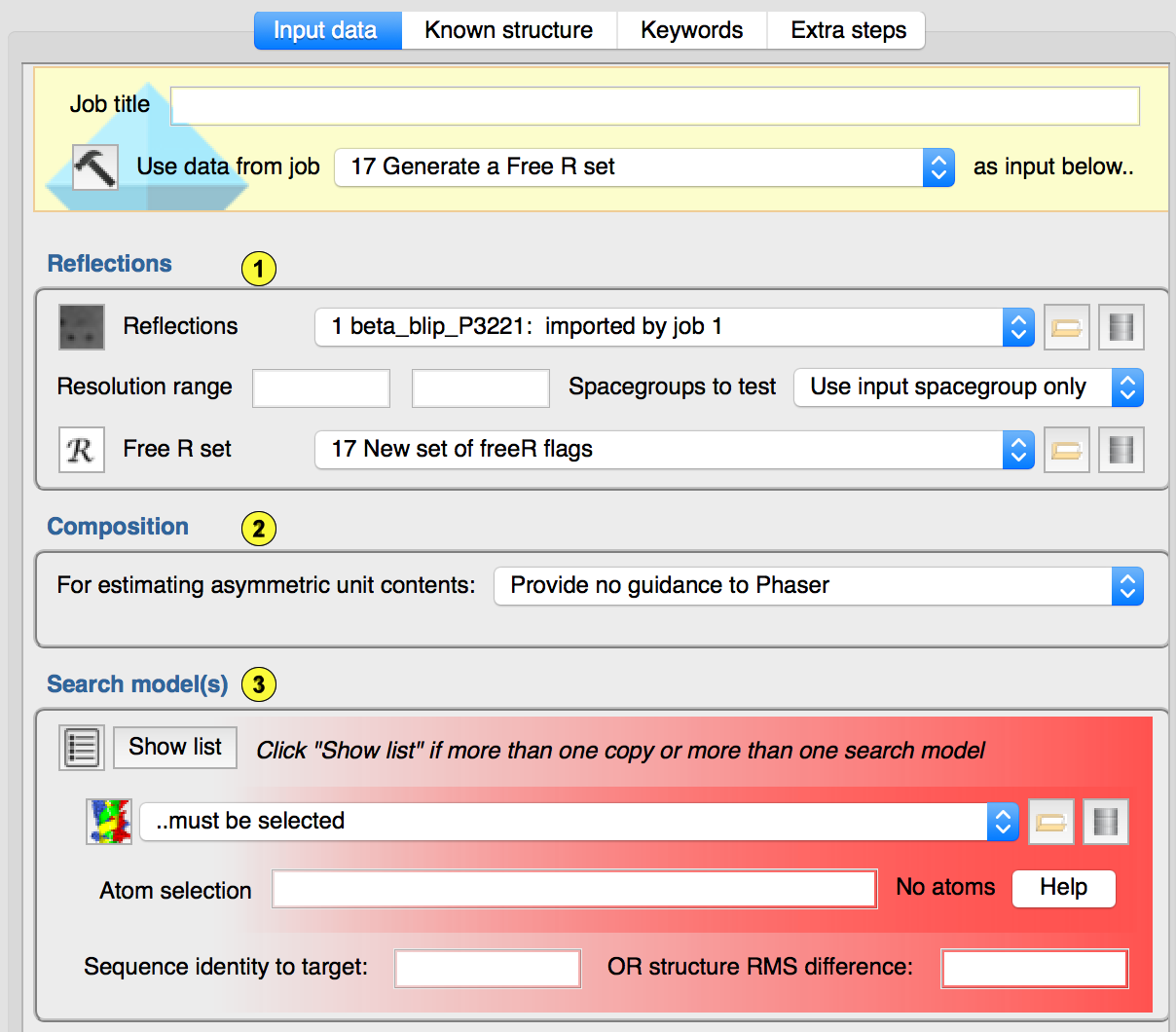 Structures: If searching with a single structure in your ensemble fails, then it may be that adding more than one (superimposed) structure into your ensemble can help. The idea is that each superimposed structure will have different strengths and weaknesses, such that the search for the composite model (i.e. ensemble) may succeed where searching for each constituent structure fails. N.B. It is currently up to the user to superimpose the structures prior to giving them to CCP4i2. When a "structure" is selected in the search model tree, the search model detail allows/requires you to specify similar properties to those described above for a simple search model.