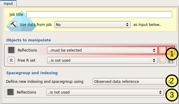 The spacesgroup and indexing information can come from an existing structure, or from a set of observations, or be specified in terms of a unit cell and spacegroup. These are selected from the menu (2). The corresponding dateset, model or values can then be selected (3).