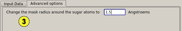 Once Privateer has calculated model and experimental electron densities, a correlation analysis is performed within the boundaries of a mask calculated around the studied sugar. This mask can be adjusted by tweaking its radius, as shown below. Then, a conformational (using the Cremer-Pople algorithm) and stereochemical analysis will follow.