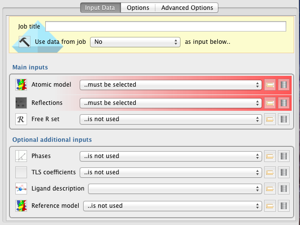 Minimally, the Refinement pipeline requires provision of a model (Atomic Model) and experimental data (Reflections).