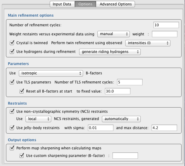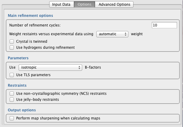 Use TLS parameters -- Automatically identify and use TLS groups during refinement. Adds 21 parameters per group, representing anisotropic displacement (concerted screw motion of rigid bodies). For more information, see here. This option is only available if an input TLS file is not provided in the "Input Data" tab - if an input TLS file is provided then TLS refinement will always be performed.