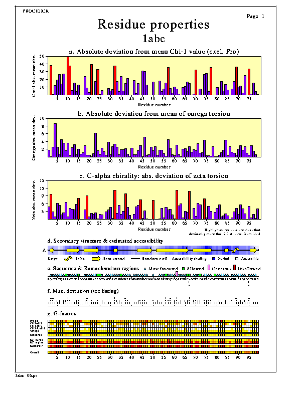 The first three graphs at the top of the page, can be selected from 14 possibles by the user. The three default graphs, which are plotted when you first run PROCHECK, are the first three of:-