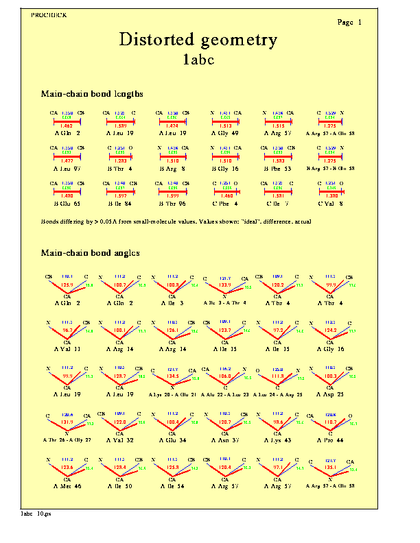 These plots shows all distorted main-chain bond lengths, main-chain bond angles, and planar groups.